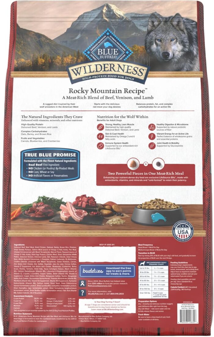 - Contains: One 24-lb bag of BLUE Wilderness High-Protein Adult Dry Dog Food; Rocky Mountain Red Meat Recipe