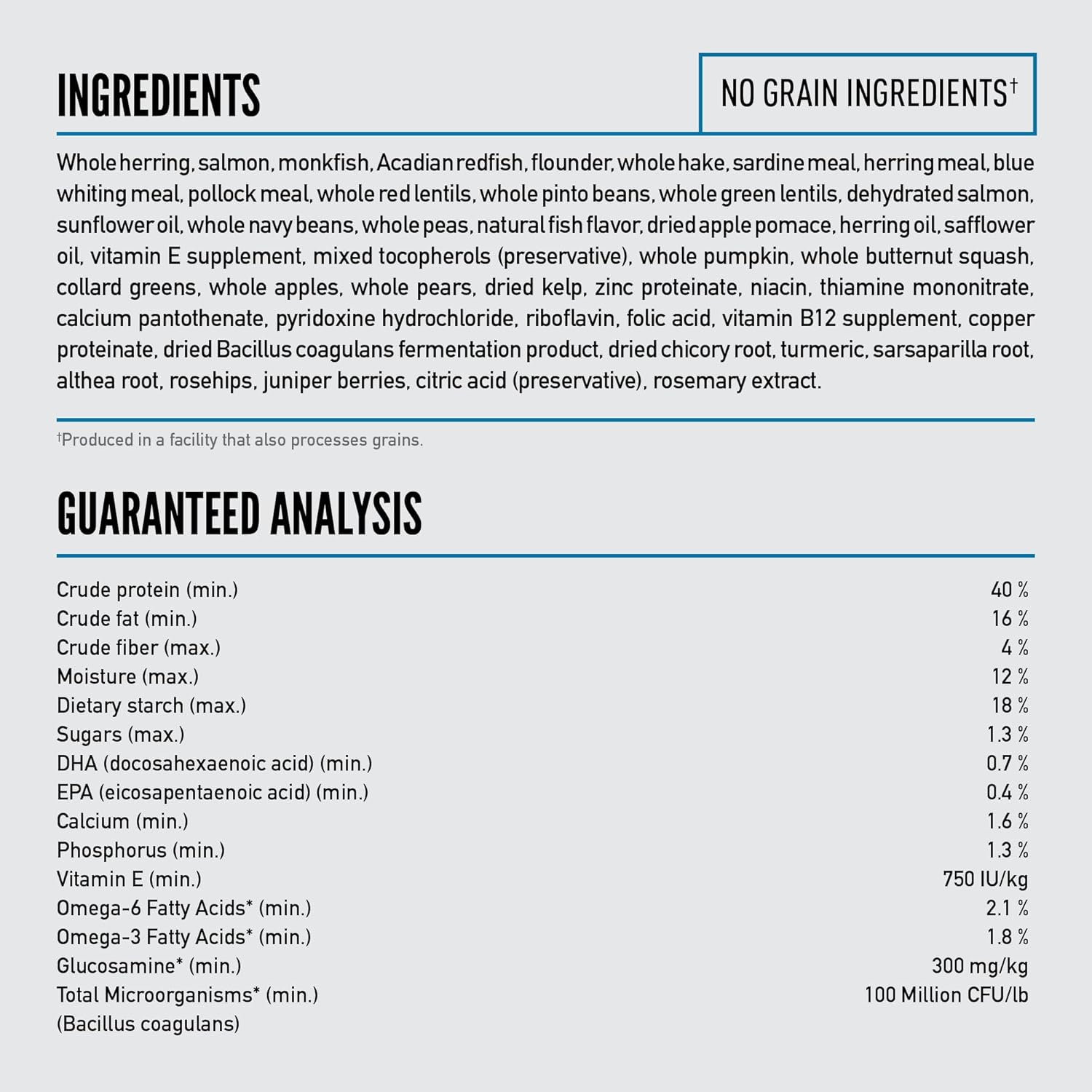 - The first six ingredients are fresh or raw whole mackerel, whole herring, monkfish, Acadian redfish, flounder and whole hake to provide your dog with a strong source of protein, vitamins and minerals